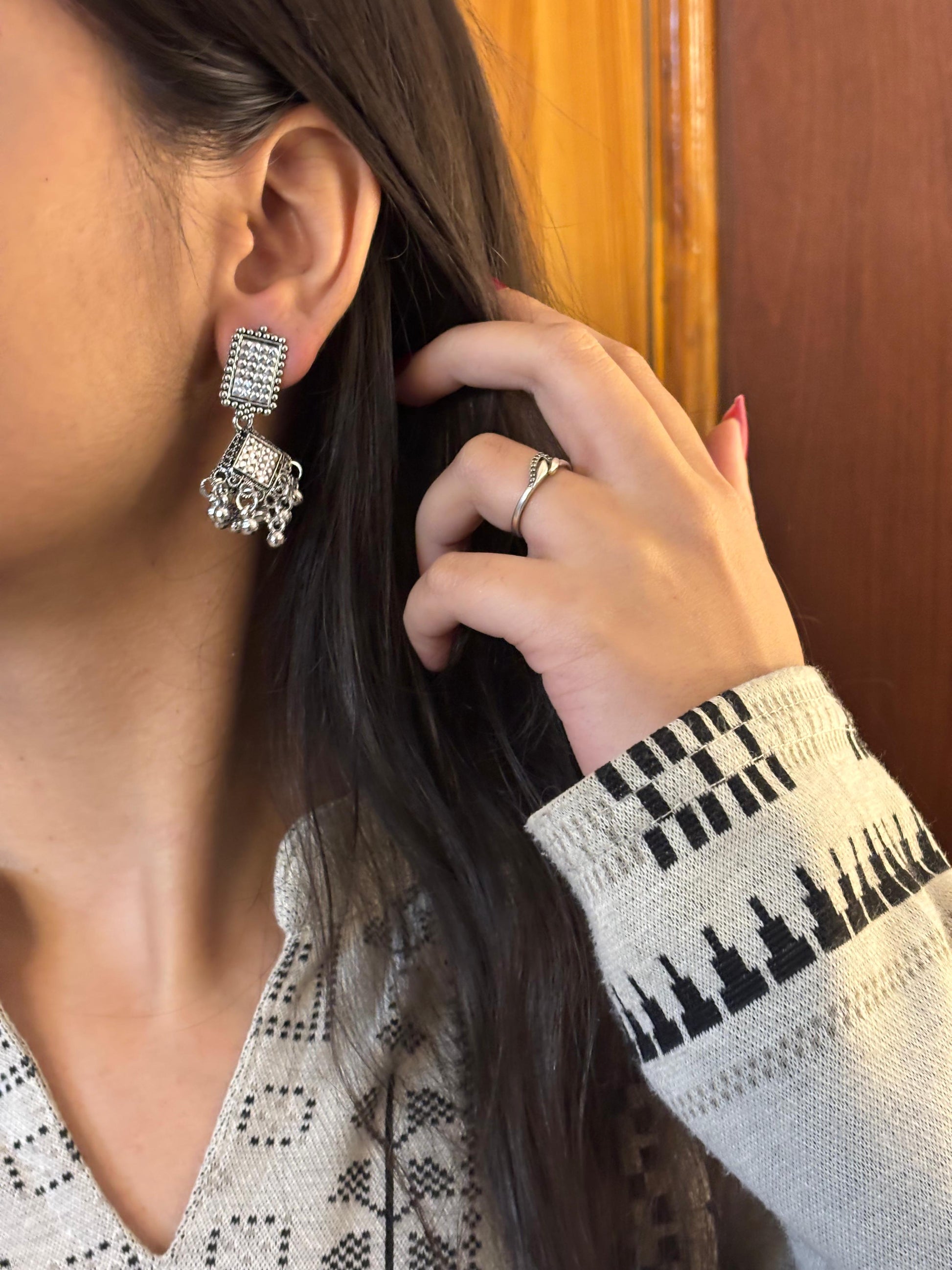 - Silver square & chain jhumka earrings β Square stone stud with chain-linked mini jhumkas and oxidised detailing.