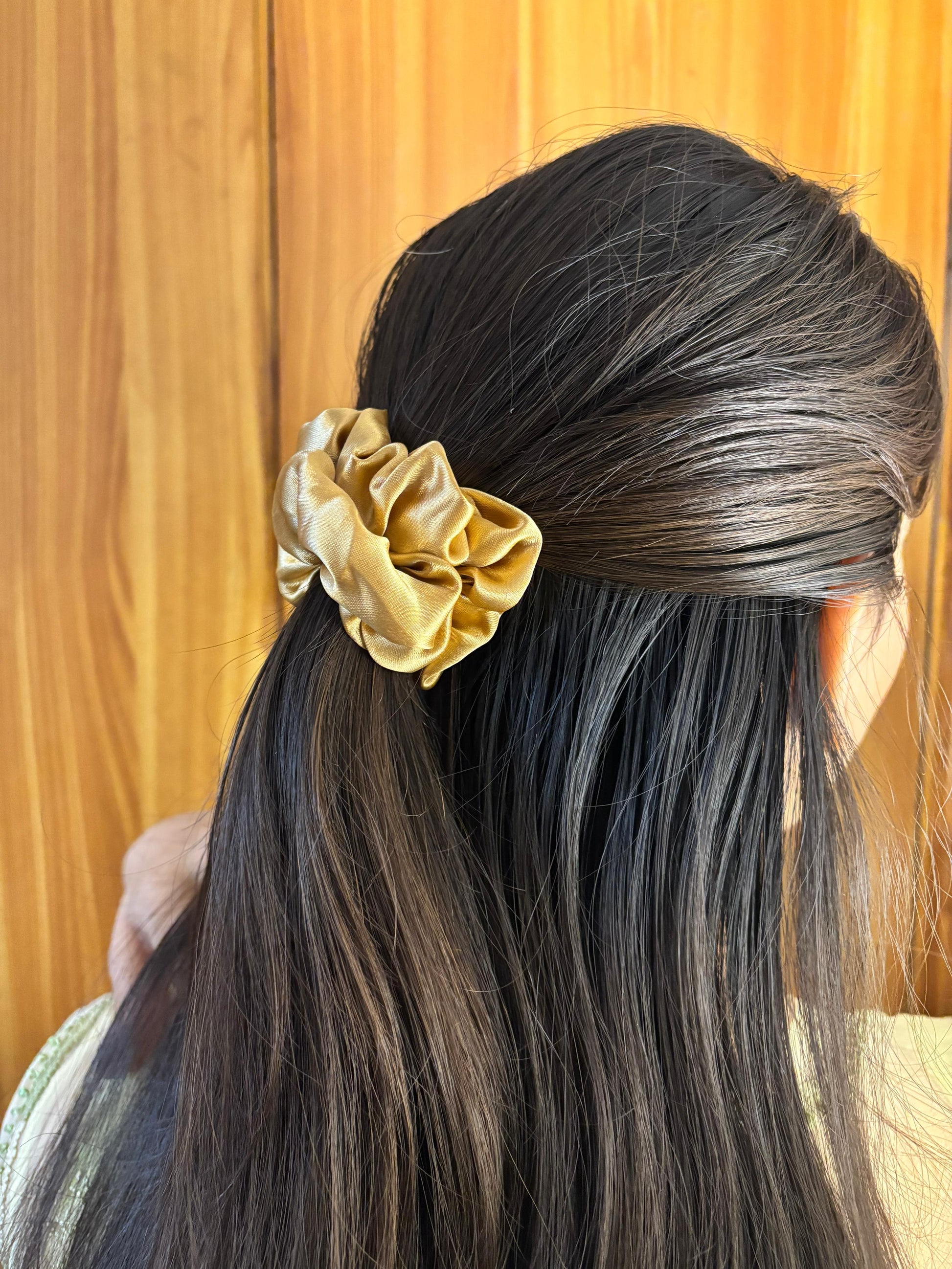 - Gold satin scrunchie β Luxe satin scrunchie in an elegant gold tone.