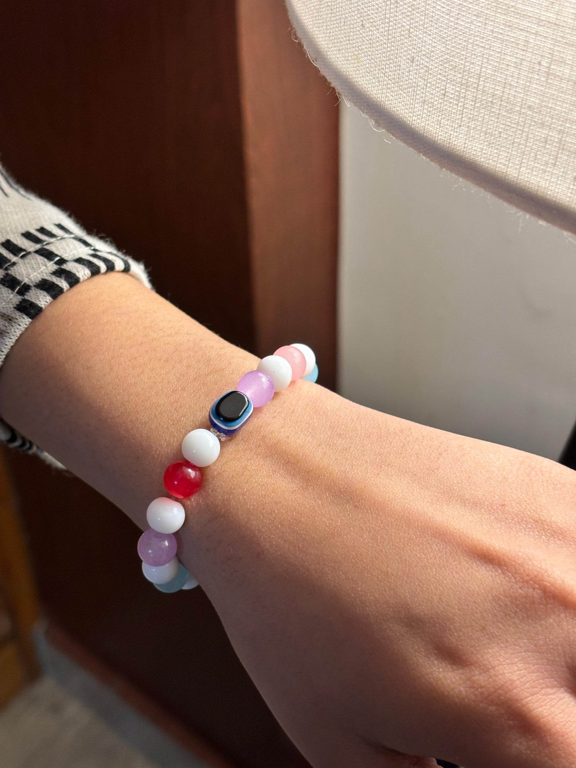 - Pastel multicolour evil eye bracelet β Elastic bracelet with soft pastel beads and a central evil eye charm.